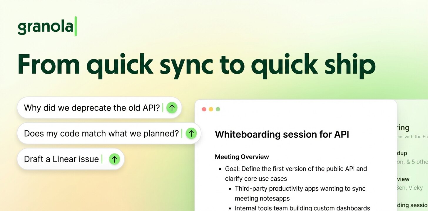 Draft Linear/Jira tickets from standup notes Paste code into Granola Chat and instantly receive a pass/fail verdict against the requirements that were discussed in your meeting.